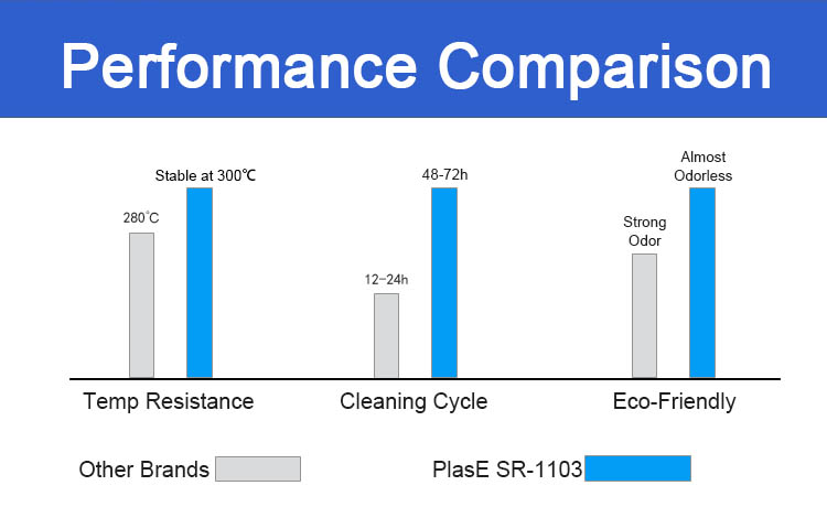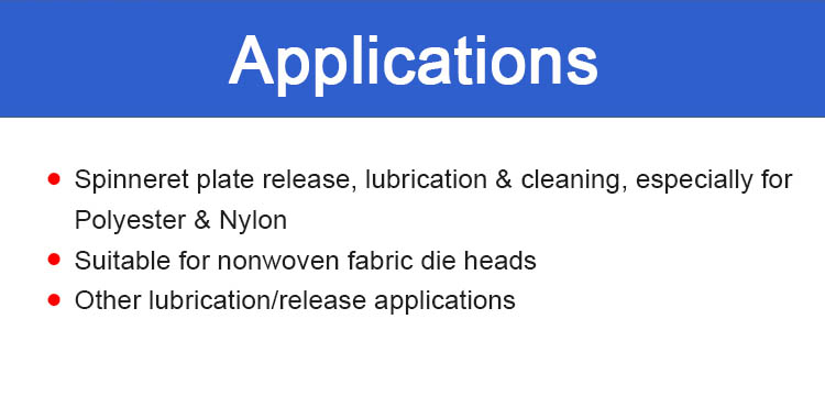 PlasE® SR 1103 is specially developed for the manufacture and treatment of synthetic fibers especially Polyester. It works stably at 330℃. It provides spinneret nozzles with excellent releasing, sliding, lubricating and cleaning properties.